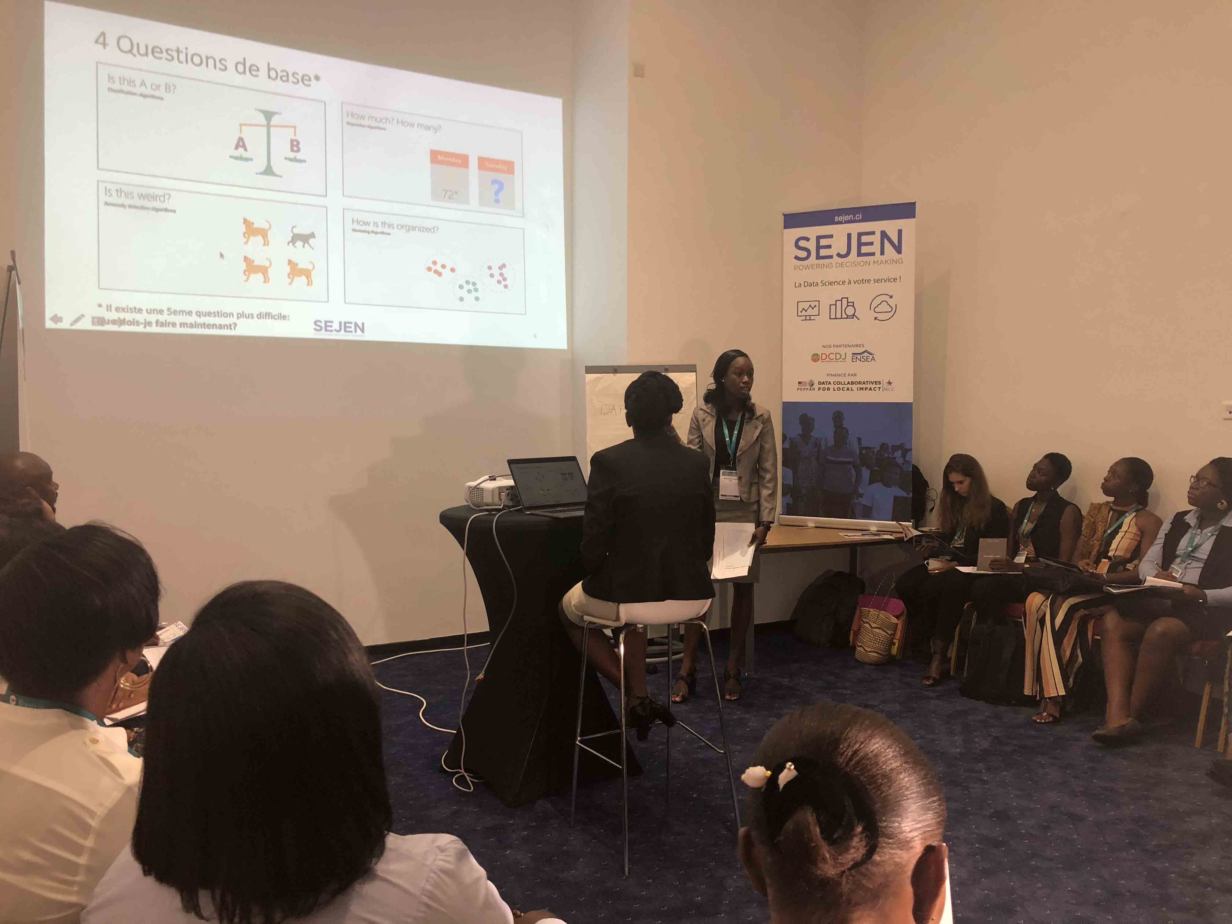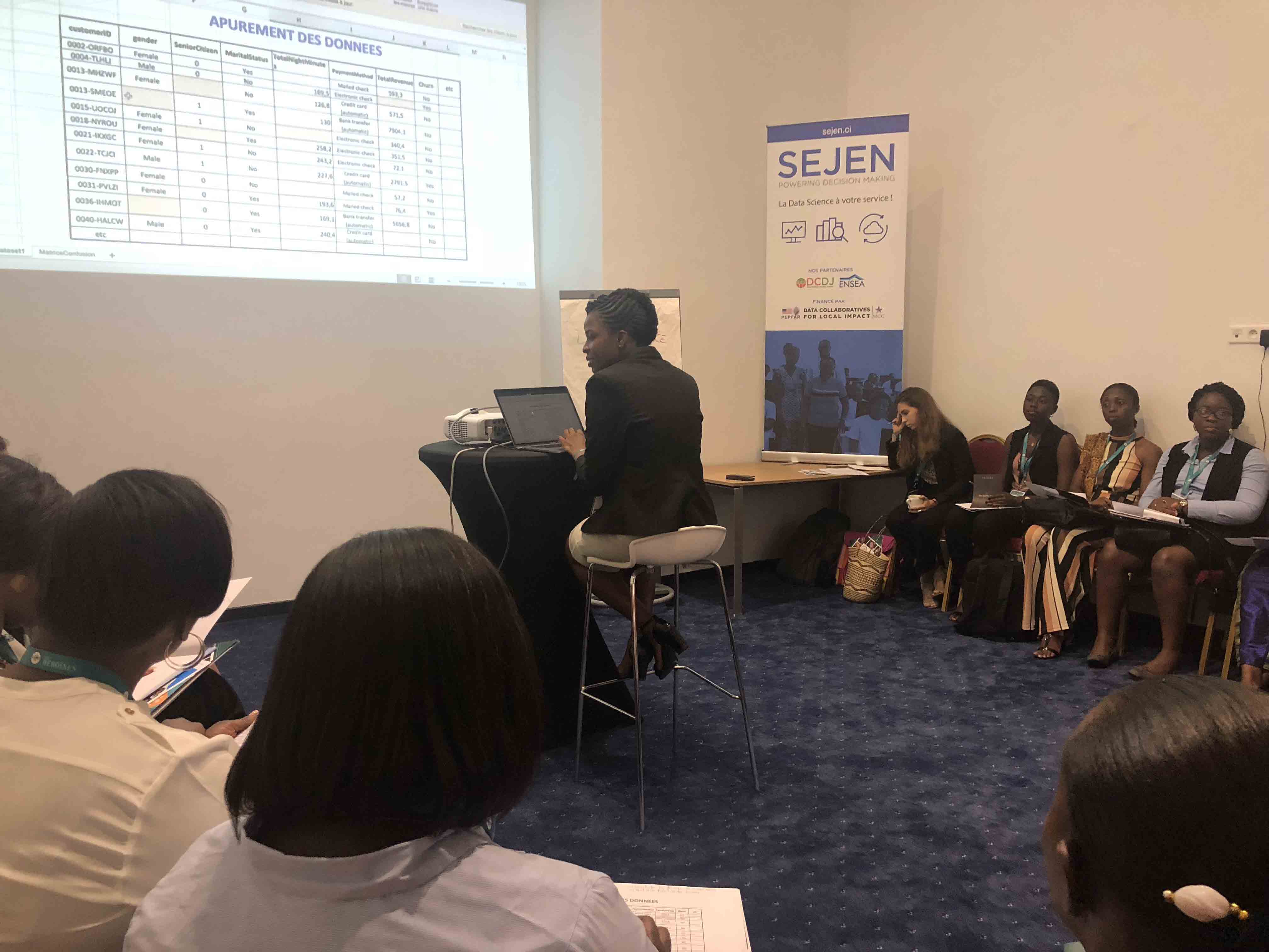 Une équipe représentant SEJEN, avec à sa tête M. Souleymane KONE (CEO de SEJEN CI), Dr Hugues KOUADIO (Directeur de l’ENSEA), Mirabelle ASSOGBA et Victoria SEDEGAN (Junior Data Scientists SEJEN CI), ont tenu en haleine les participantes autour d’un atelier thématique portant sur la thème : « Utiliser la data pour améliorer sa prise de décision». L’équipe a présenté une application pratique d’une problématique à résoudre selon une démarche propre à la science des données. Ce fut un moment exceptionnel d’échanges qui a porté ses fruits. L’audience en est sortie visiblement ravie et avec de nouvelles connaissances.